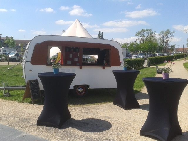 Na een korte zoektocht voor de perfecte caravan (De Reu Casablanca) volgden weken van afbreken, timmeren, opnieuw beginnen en verven. De roestige caravan onderging een volledige transformatie en is nu een prachtige mobiele cocktail- en tapasbar.