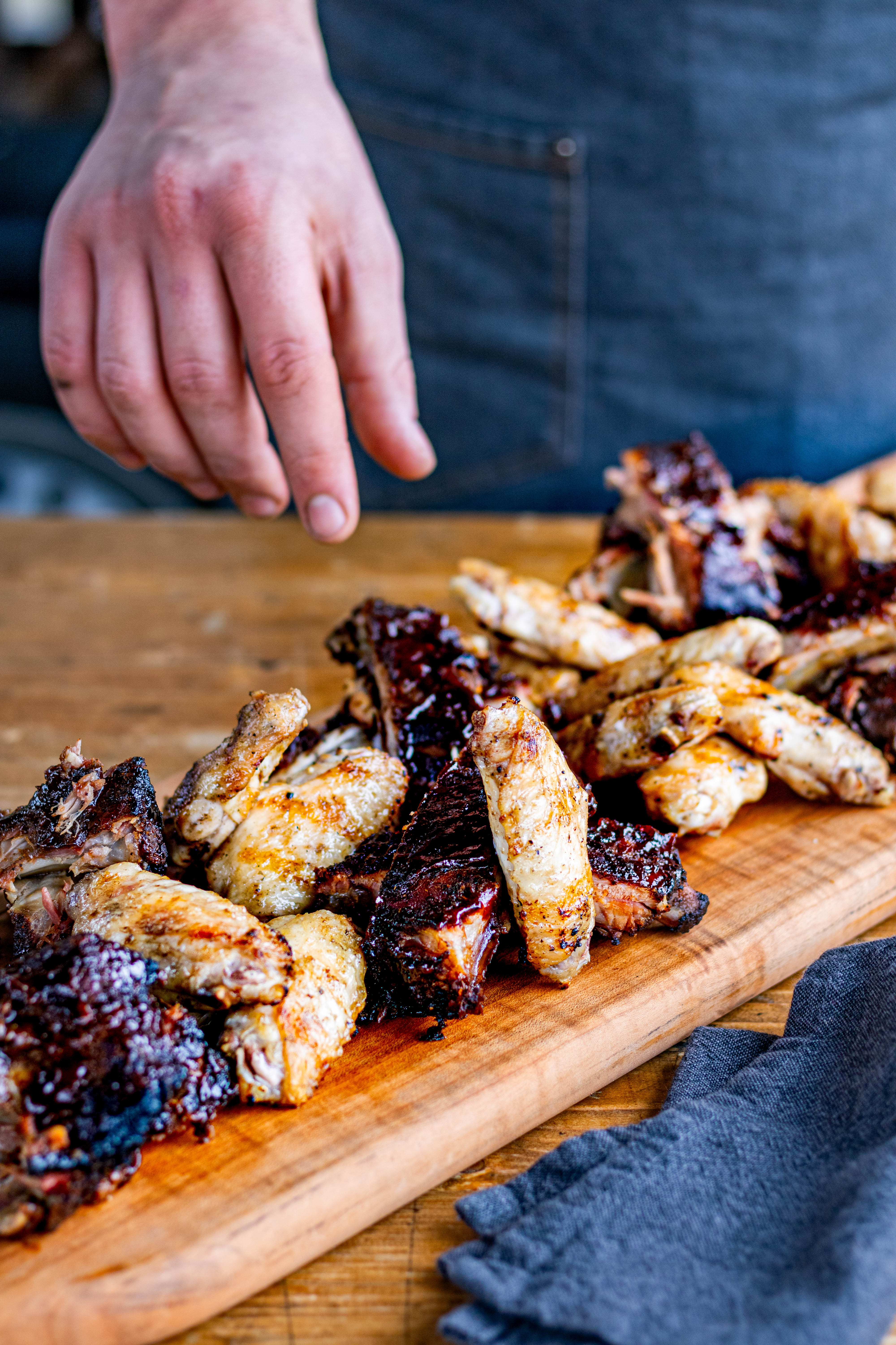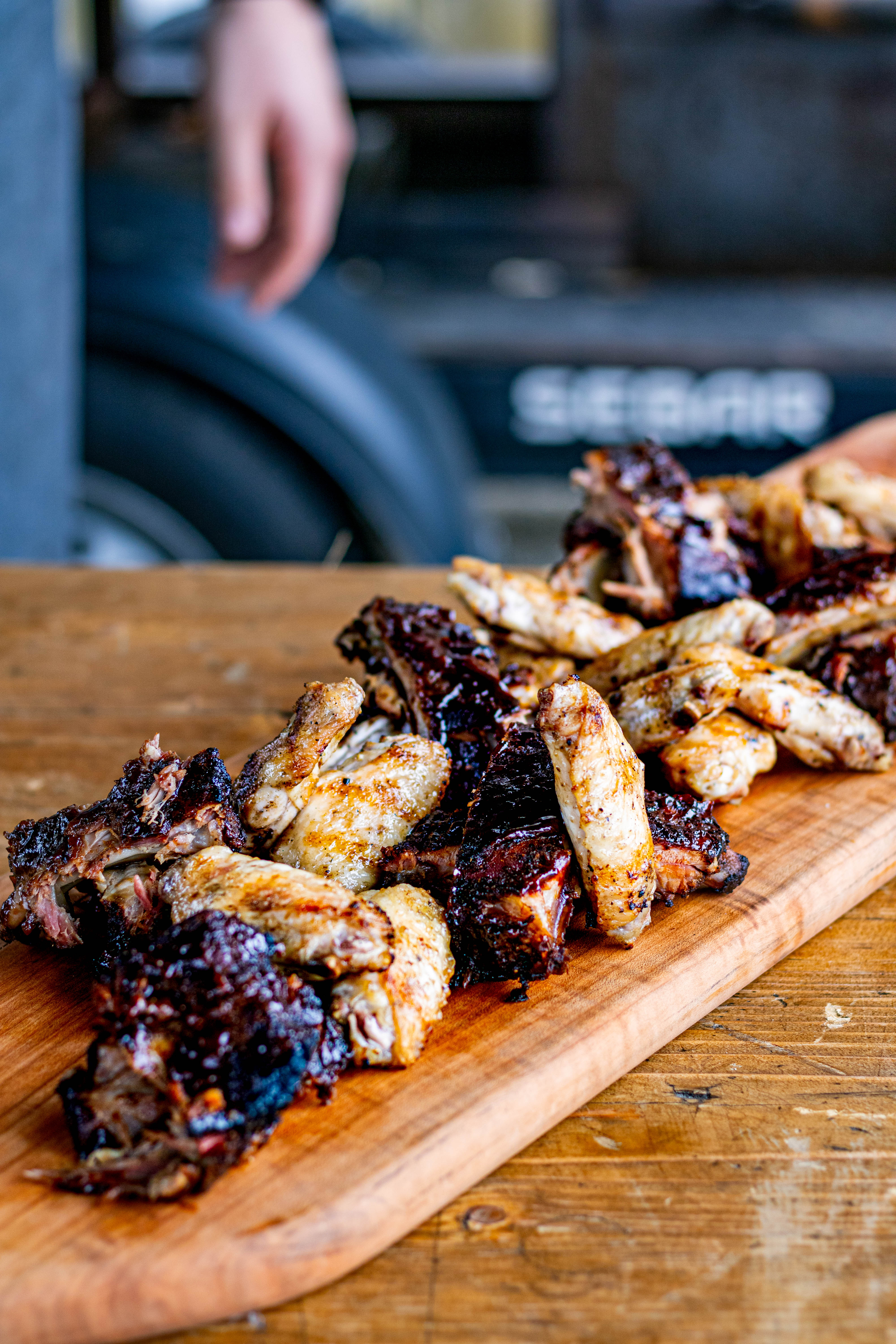 Om het feest op gang te brengen starten we met een apero plank bestaande uit 4 uur traag gegaarde spareribs en sticky chicken wings.