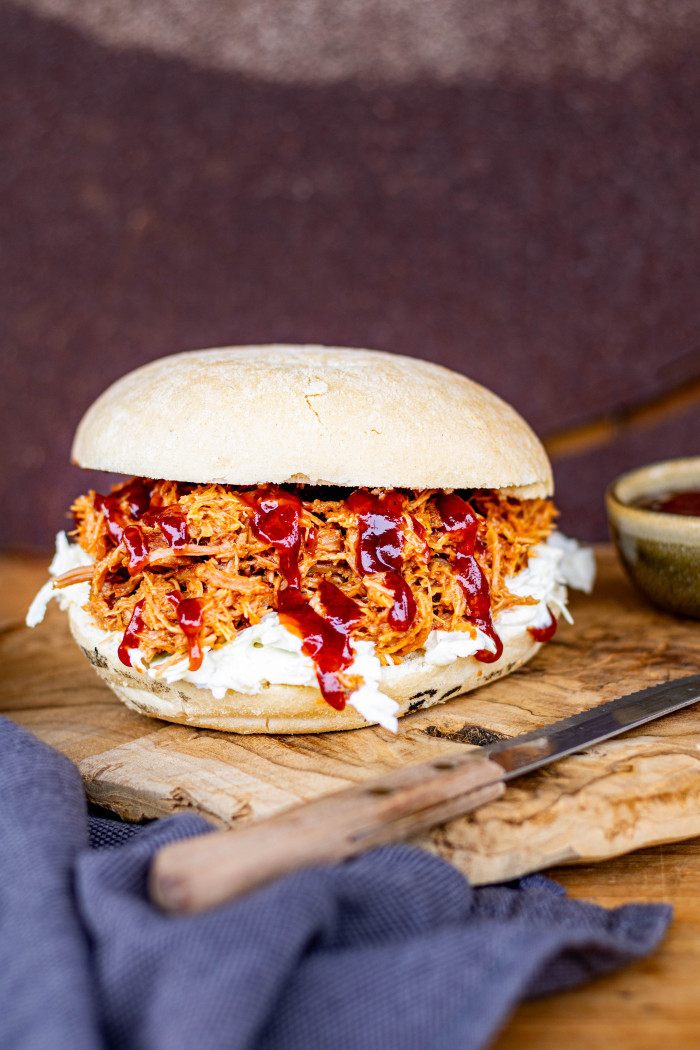 - Pulled chicken met koolsla: Traag gegaarde kip met BBQ-saus en een frisse koolsla met appel.