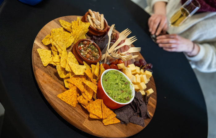 Aperoplank met guacamole, pico de gallo, nacho’s, jonge kaas, picos en charcuterie.